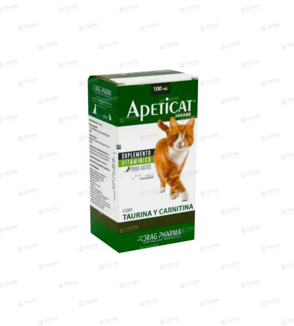 Apeticat es un suplemento formulado especialmente para gatos a base de Taurina y Carnitina, complementado con amino?cidos, vitaminas y Calcio. Su f?rmula aumenta las ganas de comer de su mascota, actuando bioenergizante y mejorador de las funciones metab?licas del organismo. La Taurina es un amino?cido que los gatos s?lo sintetizan en cantidades muy peque?as, no suficiente para satisfacer en su totalidad las necesidades fisiol?gicas del animal, su presencia en cantidad adecuada es esencial en la dieta para mantener la salud de su mascota. V?a de administraci?n y dosificaci?n: – Administrar por v?a oral 1 cucharadita (5 ml) por cada 4 kg de peso.