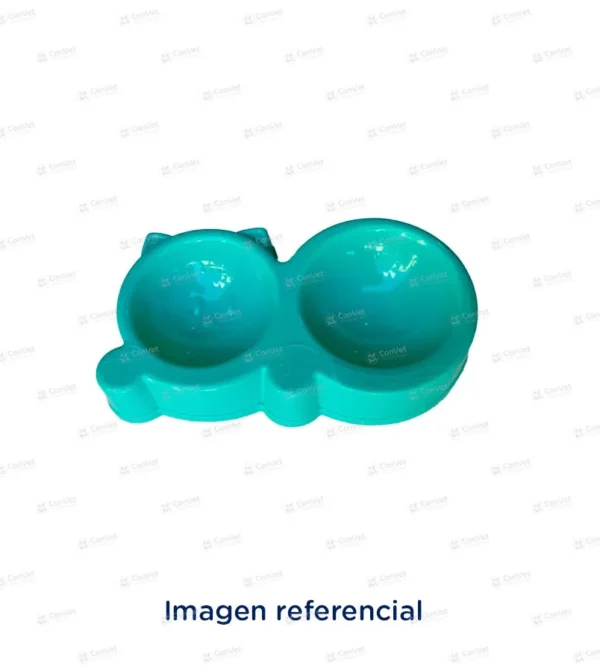 Recipiente de comida para mascotas con diseño de doble gatito con patita. Material fácil de limpiar.